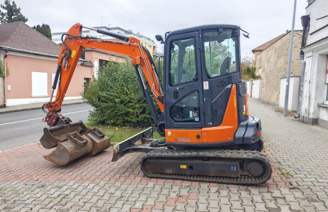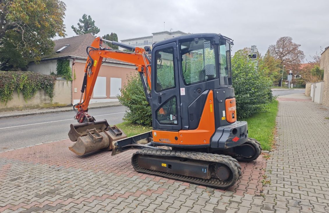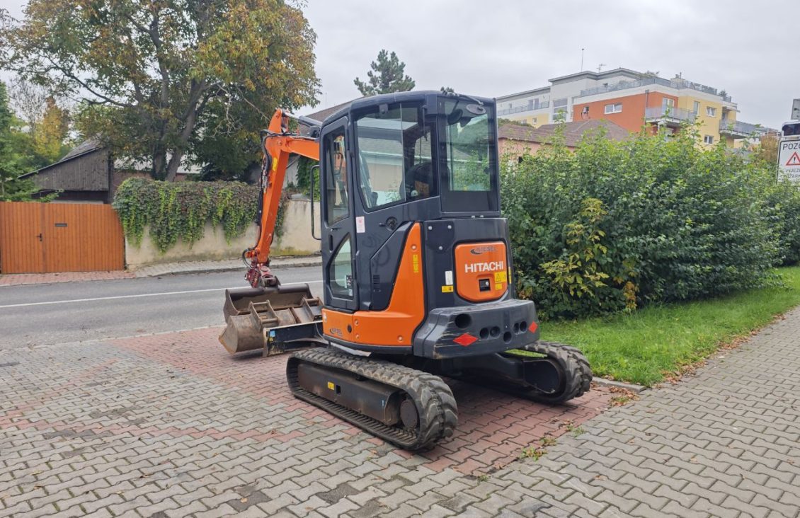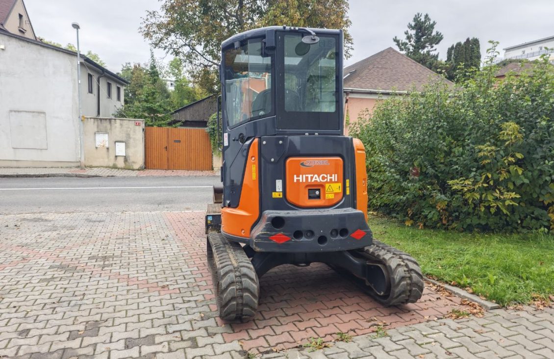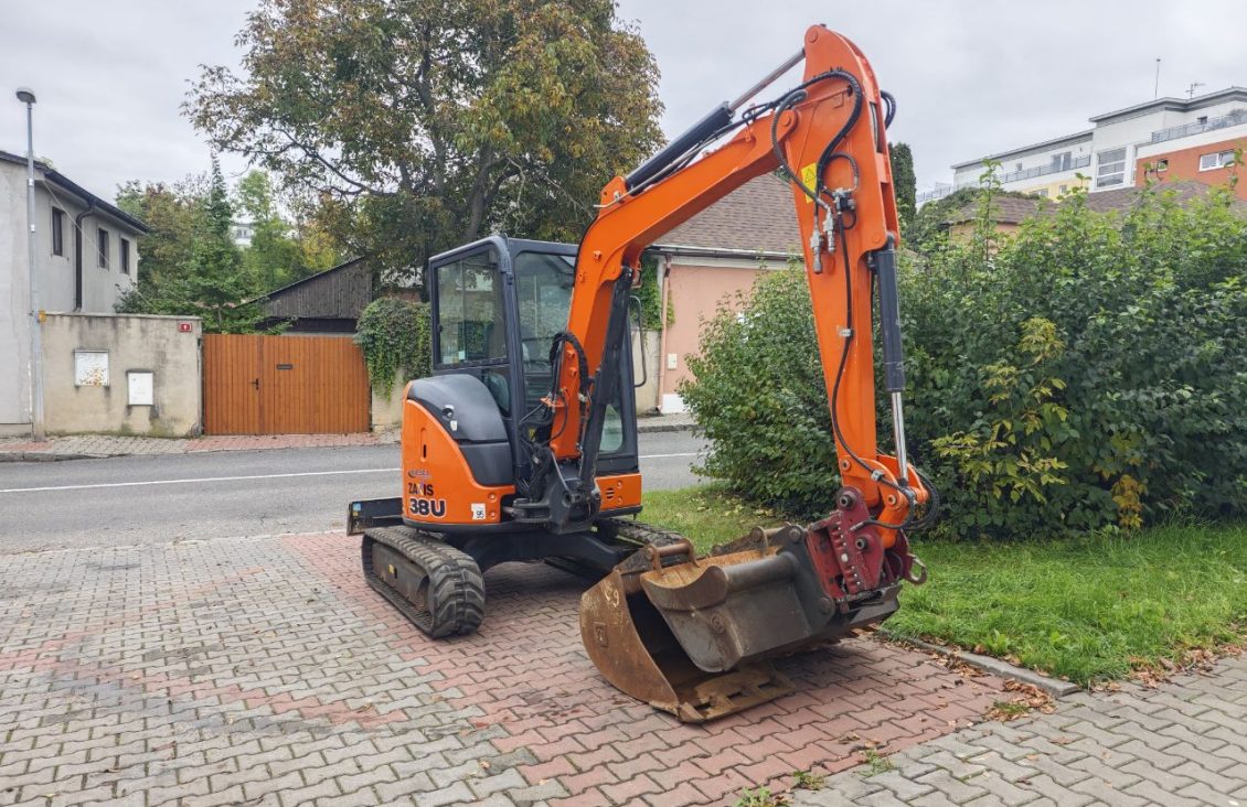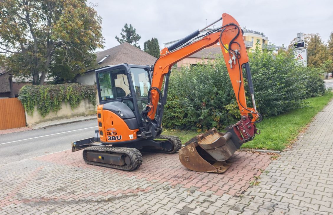Minibagr Hitachi ZX38U-5A, r.v. 2018, hmotnost 3730 kg, výkon motoru 21.2 kW, 3500 Mtg. Příslušenství lžíce svahová 120 cm, lžíce podkopová 60 cm, lžíce podkopová 80 cm, naklápěcí hlava powertilt.